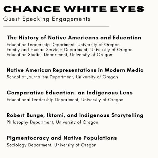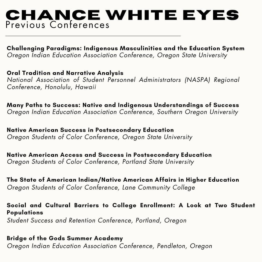 Chance White Eyes has been an invited presenter at numerous regional and national education conferences. His presentations often examine how identity, culture, and storytelling intersect with access and success in higher education. Drawing from both research and lived experience, he speaks on the social and structural factors that influence scholar pathways.