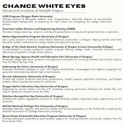 Chance White Eyes has supported a wide range of education-focused programs aimed at improving access to college and guiding scholars through the admissions process. His work includes family outreach, admissions workshops, and campus events designed to help first-time applicants understand key steps like financial aid, applications, and educational planning.
